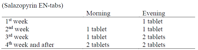 The dosage should be adjusted according to the patient’s response to treatment and tolerance to the drug. The tablets should be taken at regular intervals during the day, preferably in connection with meals. Patients not previously treated with Salazopyrin/Salazopyrin EN-tabs are recommended to increase the dose gradually during the first few weeks. The use of enteric coated tablets will reduce the incidence of gastrointestinal side effects. The enteric coated tablets must be swallowed intact, preferably after meals, and should not be crushed or broken.