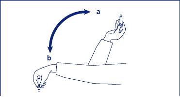 Before you put the Penfill® cartridge into the insulin delivery system, move it up and down between positions a and b and back (see the picture) so that the glass ball moves from one end of the cartridge to the other at least 20 times. Repeat this movement at least 10 times before each injection. The movement must always be repeated until the liquid appears uniformly white and cloudy. Complete the other stages of injection without delay.