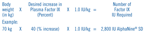 The amount of AlphaNine® SD required to establish hemostasis will vary with each patient and depend upon the circumstances. The following formula may be used as a guide in determining the number of units to be administered.16