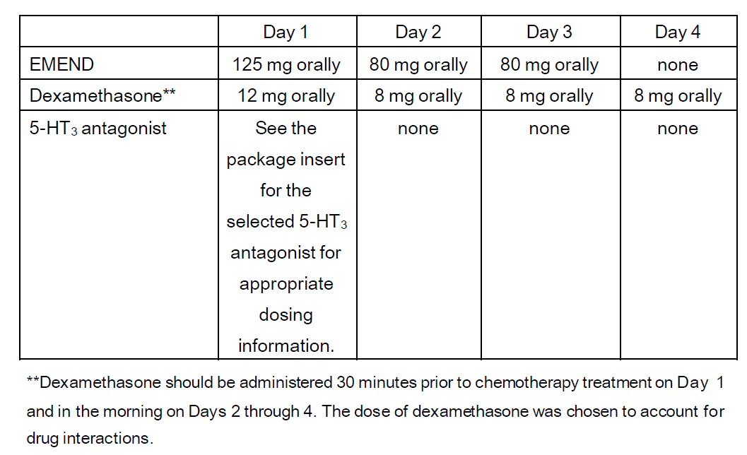 EMEND is given for 3 days as part of a regimen that includes a corticosteroid and a 5-HT3 antagonist. The recommended dose of EMEND is 125 mg orally 1 hour prior to chemotherapy treatment (Day 1) and 80 mg orally once daily in the morning on Days 2 and 3. The package insert for the co-administered 5-HT3 antagonist must be consulted prior to initiation of treatment with EMEND.