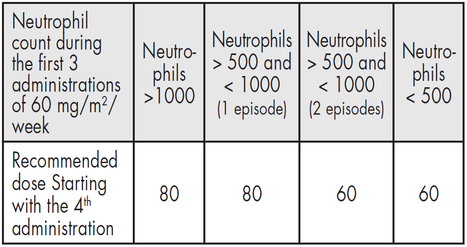 For any administration planned to be given at 80 mg/m2, if the neutrophil count is below 500/mm3, the administration should be delayed until recovery and the dose reduced from 80 to 60 mg/m2 per week during the 3 following administrations.