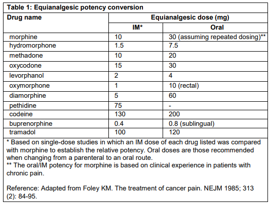 Convert this amount to the equianalgesic oral morphine dose using Table 1. All intramuscular (IM) and oral doses in this chart are considered equivalent to 10 mg of IM morphine in analgesic effect.