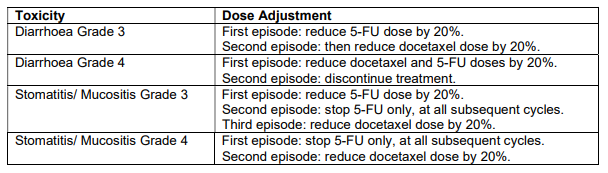 Primary G-CSF prophylaxis should be considered in patients who receive docetaxel, doxorubicin and cyclophosphamide (TAC) adjuvant therapy for breast cancer. Patients who experience febrile neutropenia and/or neutropenic infection should have their docetaxel dose reduced to 60 mg/m2 in all subsequent cycles (see sections 4.4 and 4.8 – please refer to the Product Insert/Patient Information Leaflet published on HSA for the full drug information). Patients who experience Grade 3 or 4 stomatitis should have their dose decreased to 60 mg/m2.