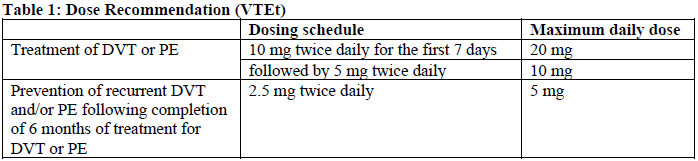 The recommended dose of apixaban for the prevention of recurrent DVT and PE is 2.5 mg taken orally twice daily. When prevention of recurrent DVT and PE is indicated, the 2.5 mg twice daily dose should be initiated following completion of 6 months of treatment with apixaban 5 mg twice daily or with another anticoagulant, as indicated in Table 1 below (see also section 5.1 – please refer to the Product Insert/Patient Information Leaflet published on HSA for the full drug information).