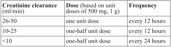 Dosage should be reduced in patients with creatinine clearance less than 51 ml/min, as scheduled below.