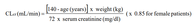 Dosage reduction in patients with compromised renal function must be individualised according to creatinine clearance (CLcr), (see section 5.2 Pharmacokinetic properties, Pharmacokinetics in special patient groups, Renal impairment – please refer to the Product Insert/Patient Information Leaflet published on HSA for the full drug information), as indicated in Table 1 determined using the following formula: