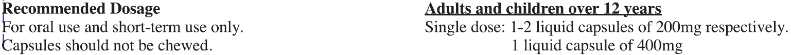 If necessary, take additional doses of 1 or 2 capsules (200mg ibuprofen) or 1 capsule (400mg ibuprofen) but do not exceed a total dose of 1200mg ibuprofen in any 24-hour period. The dosing interval should not be below 4 hours for the 200mg dose and not below 6 hours for the 400mg dose.