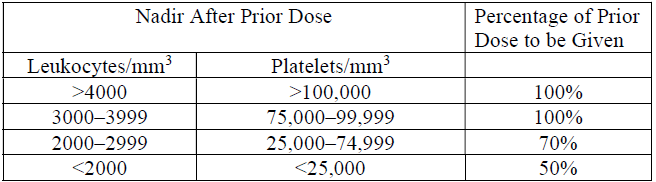 The hematologic toxicity can be delayed and cumulative. Monitor blood counts weekly. Do not administer a repeat course of BiCNU until circulating blood elements have returned to acceptable levels (platelets above 100 Gi/L, leukocytes above 4 Gi/L and absolute neutrophil count above 1 Gi/L). The usual interval between courses is 6 weeks.