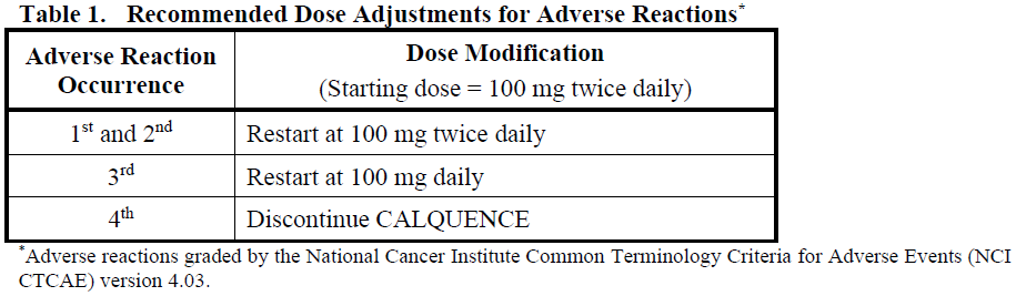 Recommended dose modifications of CALQUENCE for Grade ≥ 3 adverse reactions in patients receiving CALQUENCE monotherapy and CALQUENCE in combination with obinutuzumab or in combination with venetoclax with or without obinutuzumab are provided in Table 1.