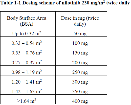 Dosing in paediatric patients is individualised and is based on body surface area (mg/m2). The recommended dose of nilotinib is 230 mg/m2 twice daily, rounded to the nearest 50 mg dose (to a maximum single dose of 400 mg) (see Table 1-1). Different strengths of Tasigna hard capsules can be combined to attain the desired dose.