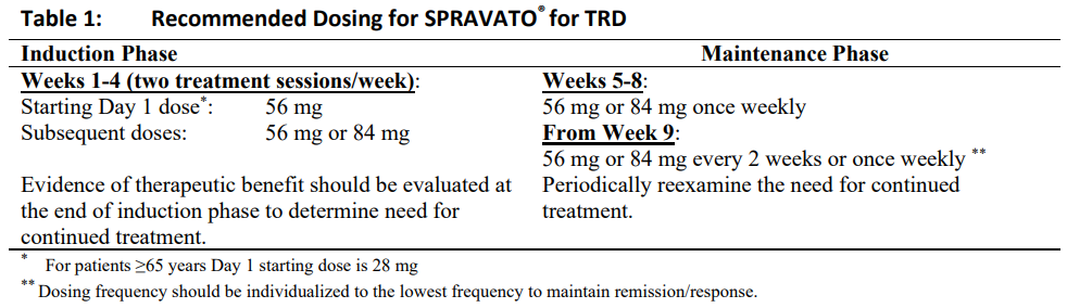 The dosage recommendations for SPRAVATO® for TRD are shown in Table 1. Dose adjustments should be made based on efficacy and tolerability to the previous dose.