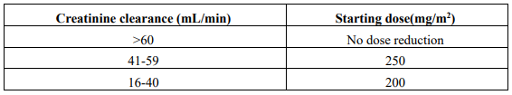 Patients with creatine clearance values below 60ml/min are at increased risk of severe myelosuppression. The frequency of severe leucopenia, neutropenia, of thrombocytopenia has been maintained at about 25% with the following dosage recommendations: