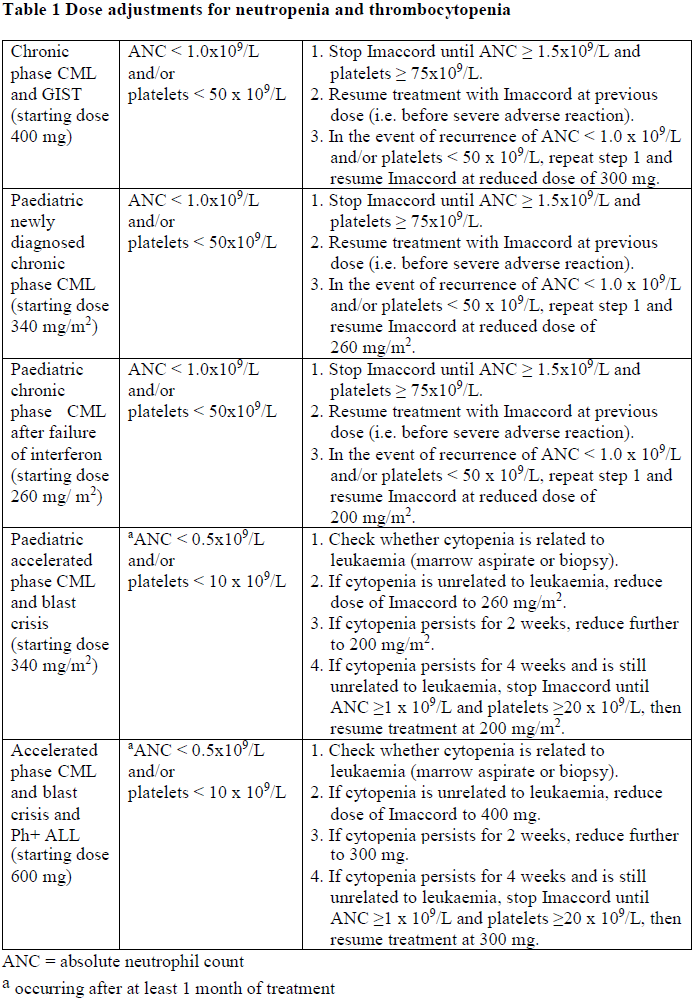 If elevations in bilirubin > 3 x institutional upper limit of normal (IULN) or in liver transaminases > 5 x IULN occur, Imaccord should be withheld until bilirubin levels have returned to a < 1.5 x IULN and transaminase levels to < 2.5 x IULN. Treatment with Imaccord may then be continued at a reduced daily dose. In adults the dose should be reduced from 400 to 300 mg, or from 600 to 400 mg, or from 800 mg to 600 mg, and in children from 260 to 200 mg/m2/day or from 340 to 260 mg/m2/day.