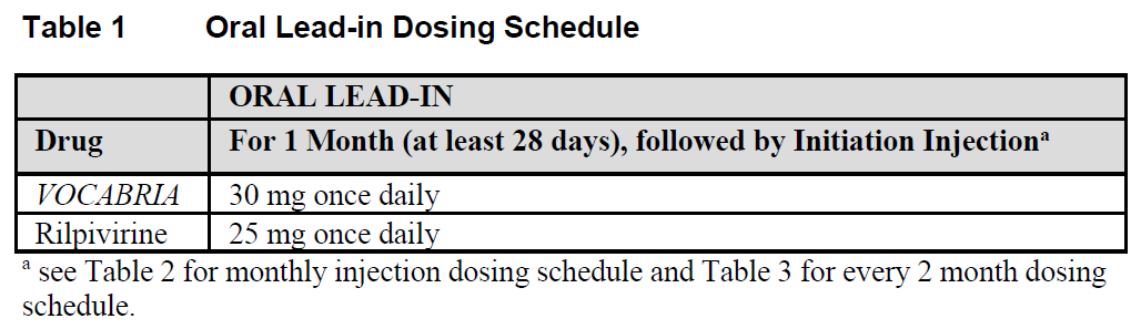 When used for oral lead-in, VOCABRIA oral tablets are recommended for approximately one month (at least 28 days) in virologically suppressed patients prior to the initiation of VOCABRIA injection to assess tolerability to cabotegravir. VOCABRIA tablets should be taken together with rilpivirine tablets.