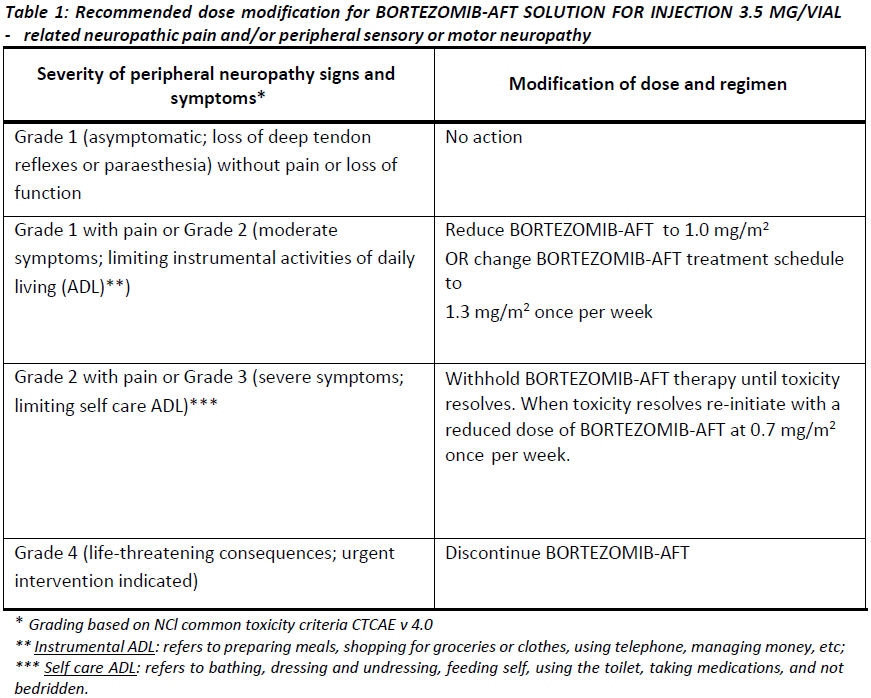 Table 1 contains the recommended dose modification for the management of patients who experience BORTEZOMIB-AFT -related neuropathic pain and/or peripheral sensory neuropathy. Severe autonomic neuropathy resulting in treatment interruption or discontinuation has been reported. Patients with pre-existing severe neuropathy should be treated with BORTEZOMIB-AFT only after careful risk/benefit assessment.