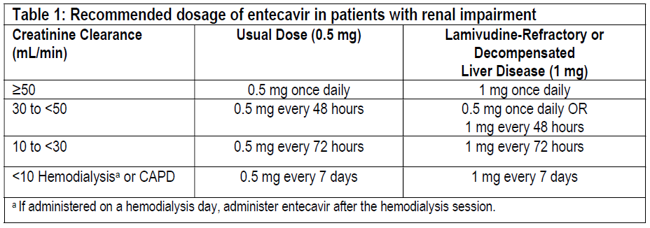 In subjects with renal impairment, the apparent oral clearance of entecavir decreased as creatinine clearance decreased [see PHARMACODYNAMIC AND PHARMACOKINETIC PROPERTIES, Pharmacodynamic effects – please refer to the Product Insert/Patient Information Leaflet published on HSA for the full drug information]. Dosage adjustment is recommended for patients with creatinine clearance less than 50 mL/min, including patients on hemodialysis or continuous ambulatory peritoneal dialysis (CAPD), as shown in Table 1. The once-daily dosing regimens are preferred.