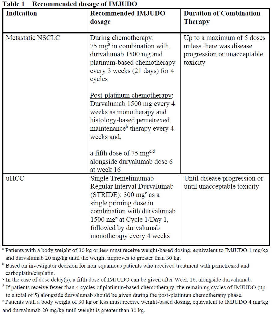 The recommended dose of IMJUDO is presented in Table 1.