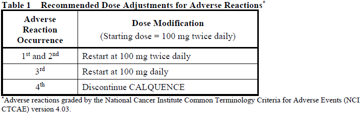 Recommended dose modifications of CALQUENCE for Grade ≥ 3 adverse reactions in patients receiving CALQUENCE monotherapy and CALQUENCE in combination with obinutuzumab or in combination with venetoclax with or without obinituzumab are provided in Table 1.
