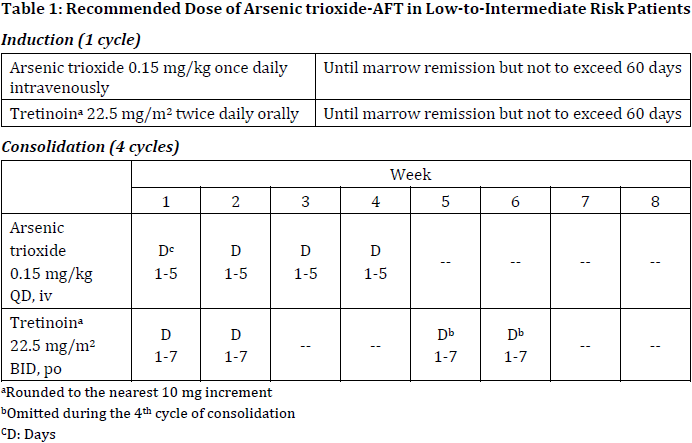 For the induction cycle, the recommended dosage of arsenic trioxide is 0.15 mg/kg intravenously daily in combination with tretinoin until bone marrow remission but not to exceed 60 days (see Table 1)