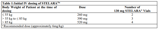 For the treatment of plaque psoriasis, STELARA® should be administered by subcutaneous injection. The recommended dose of STELARA® based on body weight is shown below (Table 2). STELARA® should be administered at week 0 and 4, then every 12 weeks thereafter.